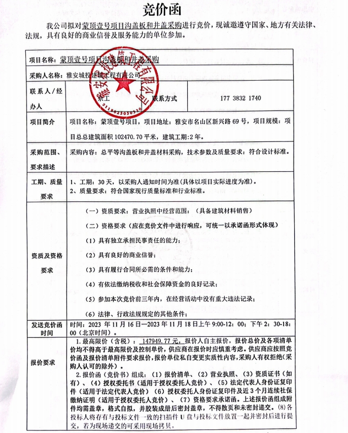 蒙頂壹號(hào)項(xiàng)目溝蓋板和井蓋采購(gòu)競(jìng)價(jià)公告