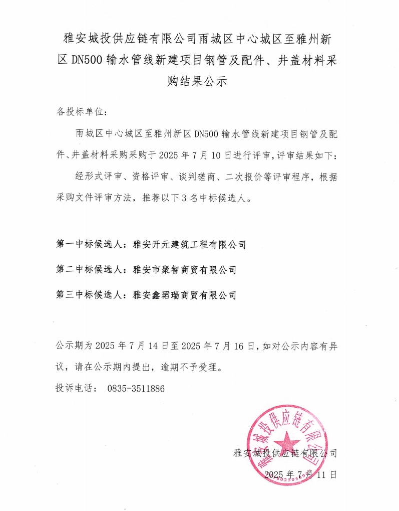 雅安城投供應鏈有限公司雨城區(qū)中心城區(qū)至雅州新區(qū)DN500輸水管線新建項目鋼管及配件、井蓋材料采購結果公示